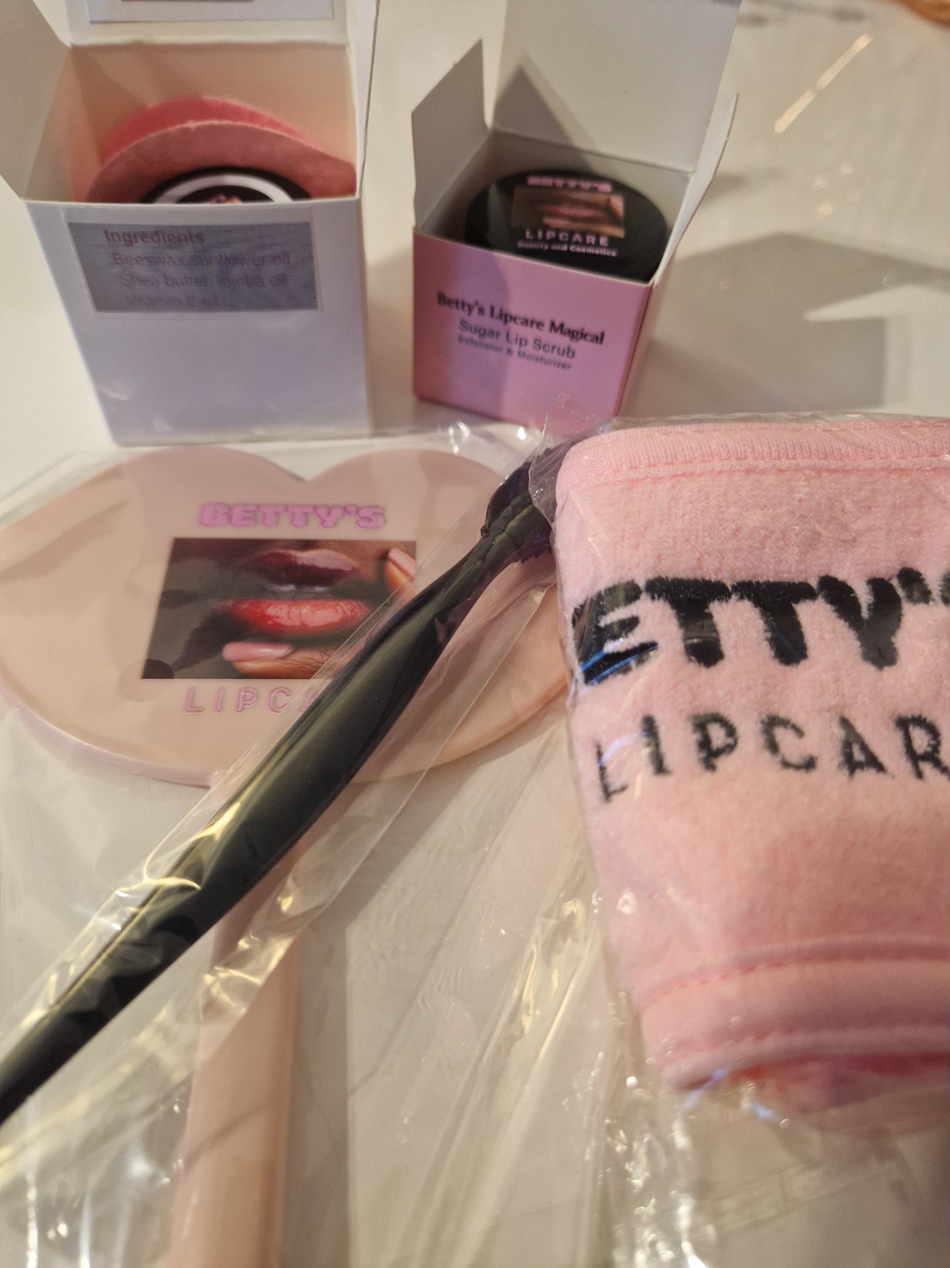 This is a homemade lip scrub set which brightens up any smile! It comes in four different flavours. It helps to remove any dead chapped skin on the lips. This set cosists of a lip scrubbing brush and a sponge for a smooth hydrating and moisturising lips , headband and a lip mirrors.